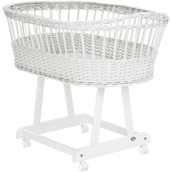 De wieg Birthe biedt nog meer comfort voor baby’s: De extra grote mand van handgevlochten wilg op een standaard van massief grenen, is veilig en flexibel door zijn vier wielen.
