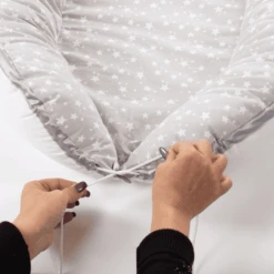 De babymat heeft ook een rits om het gewatteerde ligvlag gemakkelijk te verwijderen en is dan te wassen op 40 °C. Een knoopbare hoes voor het ligvlak van 100% organisch katoen is apart verkraar en biedt een hygienische bescherming. De grootte van het Babybay® knuffelbedje kan naar behoefte worden aangepast met de ingebouwde linten