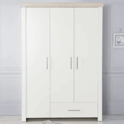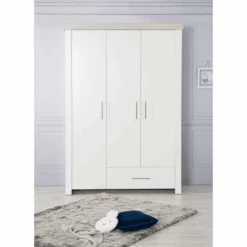 De 3-deurs roba kleerkast Lucy met corpus in wit decor en witte fronten met kroonlijst in “Luna Elm” is de hoge light in de baby- of kinderkamer. Achter de 3 deuren en een lade met elegante, zilverkleurige Metal lreling handgrepen, is er voldoende opbergruimte voor sokken, ondergoed, kinderspeelgoed of boeken. De kledingkast met 5 legplanken en een kledingroede biedt voldoende ruimte om kleding op te bergen. Dankzij de ingebouwde soft-close technologie sluiten de deuren en lades aden zacht en geruisloos. De elegante 3-deurskast kan perfect worden uitgebreid met andere baby- en kindermeubels uit de Lucy-serie, zodat een compleet ingerichte baby- of kinderkamer ontstaat met systeemmeubels die met het kind meegroeien. De babykamer garderobekast is ontwikkeld in Duitsland en is gemakkelijk in elkaar te zetten.