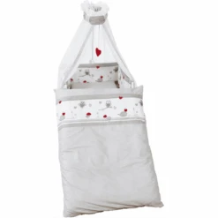 Het “Adam & Uil” Design biedt een mix van grappige bosdieren en een landhuisstijl in een mooi borduurwerk. Kussensloop 40×60 cm Dekbedovertrek 100×135 cm Nestje ca. 30×170 cm Hemeltje met 1 speelelement 163×244 cm, bedrukt Kussensloop en dekbedovertrek: 100% katoen Nestje: Overtrek 100% katoen / Vulling 100% polyester Hemel: 100% polyestervoile, rand 100% katoen wasbaar tot 40°c Geschikt voor de droger
