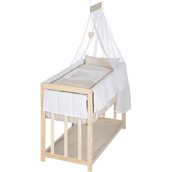 De roba Baby sitter 4 in 1, ‘Liebhabär’ is een wieg, wieg, babybedje en kinderbankje in één. De wieg wordt geleverd inclusief schuimrubberen matras, beddengoed in schattig Design van ‘Liebhabär’, tijk, gewatteerd nest, baldakijn en baldakijnstang en met lopers voor het schommelen. Het kinderledikant kan met de bijgeleverde riemen gemakkelijk en veilig aan het bed van de ouders worden bevestigd en kan niet uitglijden. Met een hoogteverstelling van 42,5 cm tot onbeperkte bedhoogte inclusief boxspringbedden kan het onderstel optimaal worden aangepast aan de hoogte van de matras van de ouders en met een flexibele en onzichtbare bevestiging aan het bed van de ouders worden bevestigd. Door middel van de bijgeleverde lopers kan het bassinet eenvoudig worden omgebouwd tot een wieg. Het liefdevol vormgegeven textiel in de Design ‘Liebhabär’ van de Babysitter 4 in 1 biedt een optimaal slaapklimaat. Het 2-delige beddengoed bestaat uit een kussen van 40×35 cm en een dekbed van 80×80 cm. Het kinderdekbed is gemaakt van een ademende en temperatuurbalancerende klimaatvezelvulling van 100% polyester. De bekledingsstof is gemaakt van 100% katoen. De quilt kan het hele jaar door gebruikt worden en is slijtvast en gemakkelijk te onderhouden, omdat de quilt niet uitglijdt als hij gewassen wordt. De roba 4 in 1 wieg is geschikt vanaf de geboorte en groeit mee met het kind tot een wieg voor oudere kinderen. Het multifunctionele talent is ook gemakkelijk te monteren (ca. 30 minuten). Zowel de bassinet als de complete uitrusting is door TĂśV getest en ontwikkeld en geproduceerd met een veiligheidsbarrière volgens de laatste veiligheidsnormen van de EN 1130:2019-norm. Alle materialen die gebruikt worden in de roba Stubenbett Babysitter 4 in 1 zijn getest op schadelijke stoffen, gecertificeerd en regelmatig geĂŻnspecteerd. Het roba bassinet ‘Liebhabär’ met platte staven is gemaakt van massief hout (beuken). Het ligvlak is 90 x 45 cm. Totale afmetingen: hoogte met luifel 145 cm x breedte (zonder/met lopers) 50/76 cm x diepte 95 cm.