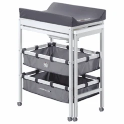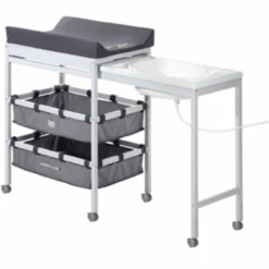 Deze praktische was- en wisselcombinatie is gemaakt van stevig massief hout. In een handomdraai kan hij worden omgevormd van een luiertafel tot een wasgelegenheid. De met textiel beklede verschoonmat is gecoat met onschadelijke polyurethaan en is daardoor huidvriendelijk, afwasbaar en gemakkelijk te reinigen. Het bad kan indien nodig onder de luiertafel worden uitgetrokken en na de B aden weer onder de luiertafel verdwijnen. De afvoerslang van de badkuip maakt het gemakkelijk om het badwater af te voeren zonder de badkuip te verplaatsen. Bovendien heeft deze was- en wisselcombinatie twee stoffen opbergvakken om al het nodige keukengerei in op te bergen. De houten basis is oprolbaar voor een eenvoudige verplaatsing.
