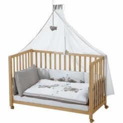 Door middel van een rits kan een deel van de stofzijde (canvas) op elk moment snel en eenvoudig worden geopend. Op deze manier kan met name de moeder dichtbij haar kind zijn – overdag of ’s nachts. Een rollenset met rem zorgt voor de nodige mobiliteit Textiel uit onze huidige roba-collecties, dat inbegrepen is, zorgt ook voor de nodige knuffelfactor.