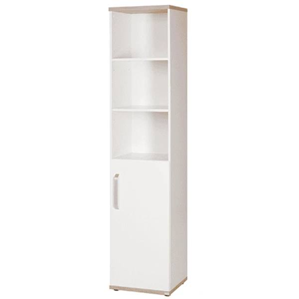 Wit decor met elementen in “Sanremo eik” zijn de bijzondere kenmerken van deze staande plank. Decor wordt modern hier gecombineerd met technische kennis. Soft close bij de deur is standaard. De standplank creëert extra opbergruimte in de kinderkamer. Uitgerust met een deur kunnen zelfs kleine schuilplaatsen worden gecreëerd.