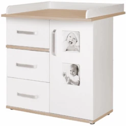 Decoratieve elementen in Sanremo eik zijn de bijzondere kenmerken van het meubilair uit de roba kinderkamerserie Pia. In deze kinderkamer wordt het speciale decor gecombineerd met technische kennis. Softclose voor deuren en laden aden mag hier niet ontbreken. Een bijzondere blikvanger zijn de geïntegreerde fotolijsten – uitgerust met persoonlijke foto’s wordt elk meubelstuk uniek. De Pia-wisselkast is ook uitgerust met een wisselhulpstuk. Met het Pia-zijplankje roba kan de lege ruimte onder het omkleedblad optimaal worden benut.