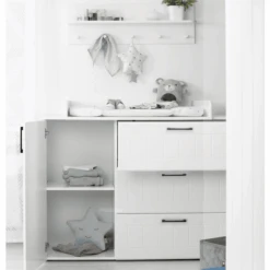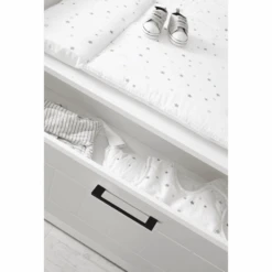 De brede verschoonunit Sylt van roba overtuigt door zijn kunstig gefreesde MDF-front en de hoogwaardige zwarte Metal handgrepen in wit. De commode wordt geleverd met een uitneembare verschoonunit, die zonder zichtbare schroeven in het bovenpaneel kan worden gemonteerd. De verschoonunit biedt voldoende opbergruimte voor alle verschoonbenodigdheden. Dankzij het afneembare wisselblad zal deze commode ook later een sieraad zijn in uw jeugd- of zelfs woonkamer. De ingebouwde soft-close technologie zorgt ervoor dat de deuren en lades aden soepel en veilig sluiten.