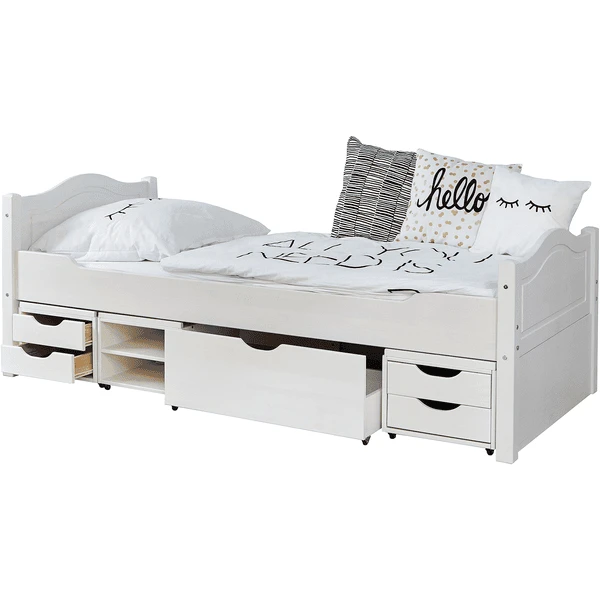 TiCAA Eenpersoonsbed Leni 100 x 200 cm dennenhout wit met 4 functie laden aden