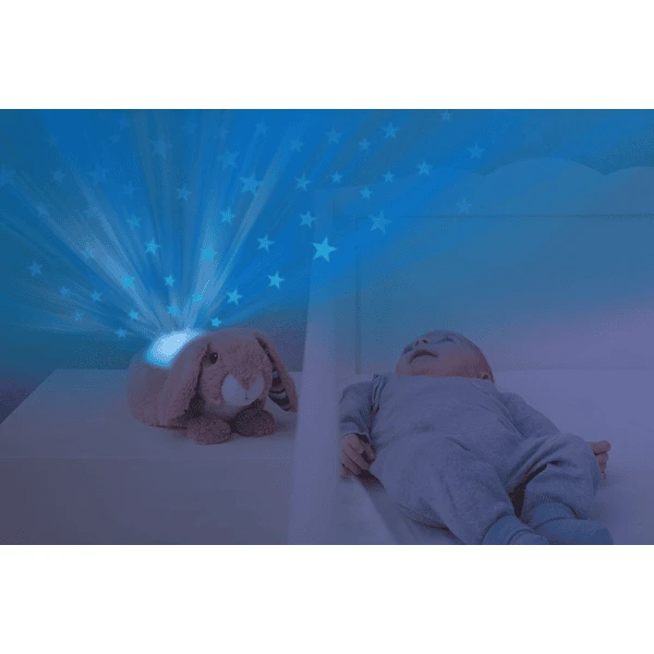 Ruby, het schattige pluche konijntje met een sterprojector op zijn rug, tovert een magische sterrenhemel naar het plafond. Voor de sterprojecties kunt u kiezen tussen drie kleuren of wisselende kleuren. Hartslag, lawaai of loungemuziek zijn beschikbaar voor de rustgevende geluiden. Na ca. 30 minuten gaat het licht automatisch uit en na ca. 15 minuten gaat het geluid automatisch uit. Als de geluidssensor wordt geactiveerd, gaat het licht weer aan als de baby huilt. Ruby werkt op batterijen. Er zijn drie AA-batterijen nodig. De batterijen zijn NIET bij de levering inbegrepen Het is geschikt vanaf de geboorte.